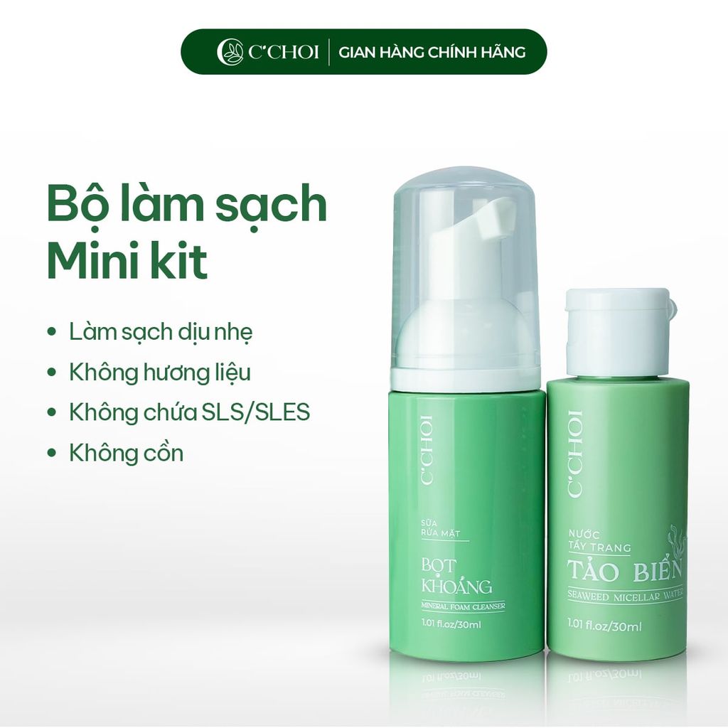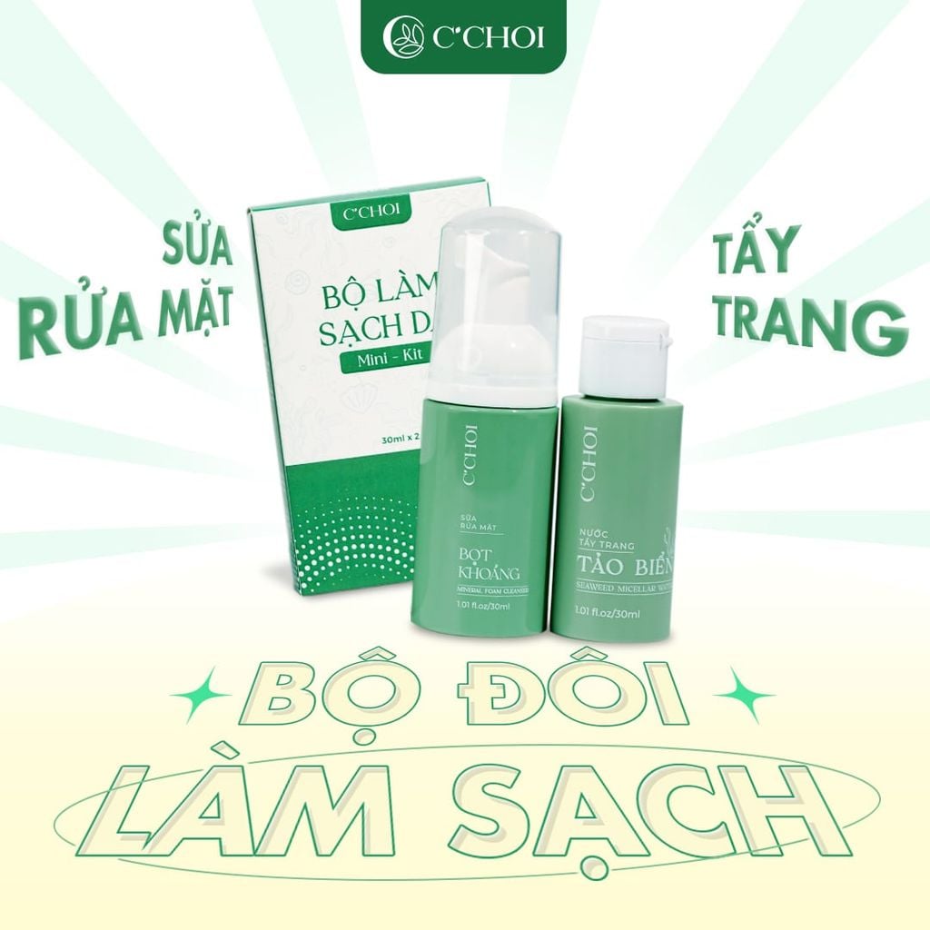 Bộ làm sạch da mini kit C’Choi là giải pháp làm sạch toàn diện được gói gọn trong thiết kế nhỏ gọn, cực kỳ tiện lợi cho các chuyến du lịch, công tác hoặc dành cho những ai muốn trải nghiệm dòng sản phẩm chăm sóc da thiên nhiên từ C’Choi. Bộ đôi kết hợp sức mạnh từ Tảo biển và Khoáng chất, giúp làn da sạch sâu, thông thoáng và tràn đầy sức sống.